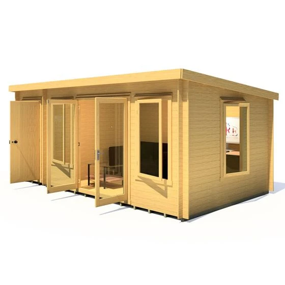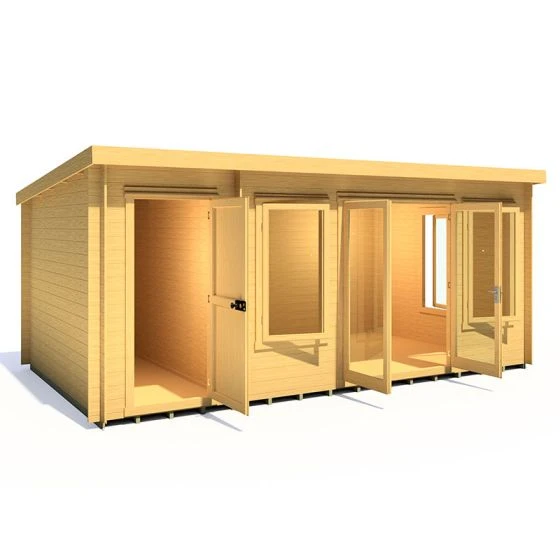 Expertly manufactured in the UK, from 19mm Northern European pine logs, this garden cabin is strong, durable and well insulated. The floor is constructed from 12mm tongue and groove, and supported by pressure-treated bearers to protect it from rot-causing ground moisture. The roof is made from 12mm tongue and groove too. It features a modern pent design and is fitted with a premium mineral-felt cover for complete weatherproof protection.