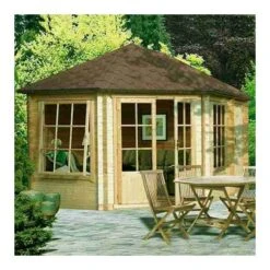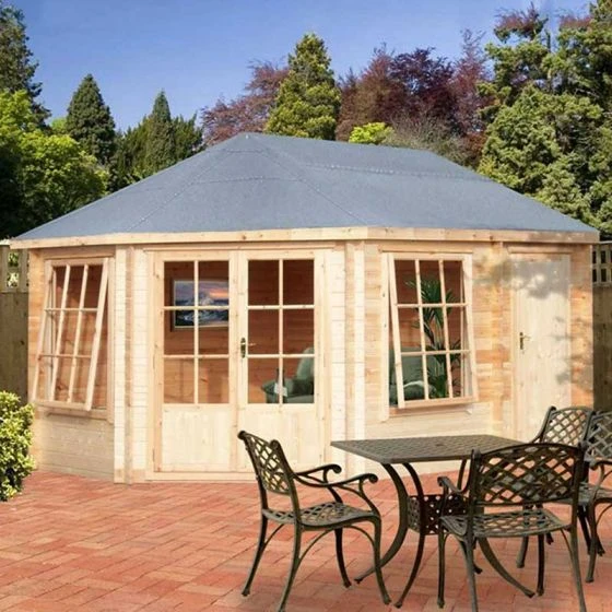 We have a wide range of log cabins or gardens, including the stunning Villandry corner log cabin. Its design allows it to tuck away into those unused corners of your garden and create a safe haven for you to enjoy all year round. Use the cabin to enjoy the tranquility and warmth of the summer, and transform the space into a cosy hideaway during the colder months. The large opening windows and double doors allow plenty of light to enter the interior, and it also keep it nice and airy. This cabin has an excellent added bonus of an integral shed/store. It is the perfect combination of a log cabin and a shed – you get the best of both! The leisure room section measures approximately 9′ x 9′ and the store 9′ x 4’5. Manufactured using untreated high-grade 28mm pine logs, which are more than twice the thickness of a standard wooden garden shed.