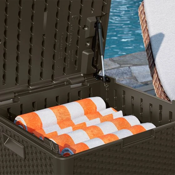 The deck box has a range of high qualities which ensure it is an excellent product. It’s high quality double-wall resin construction and stay dry design ensures long lasting protection against the elements for all your stored items. The Cubes gas-assisted opening mechanism prevents slamming and provides easy operation.